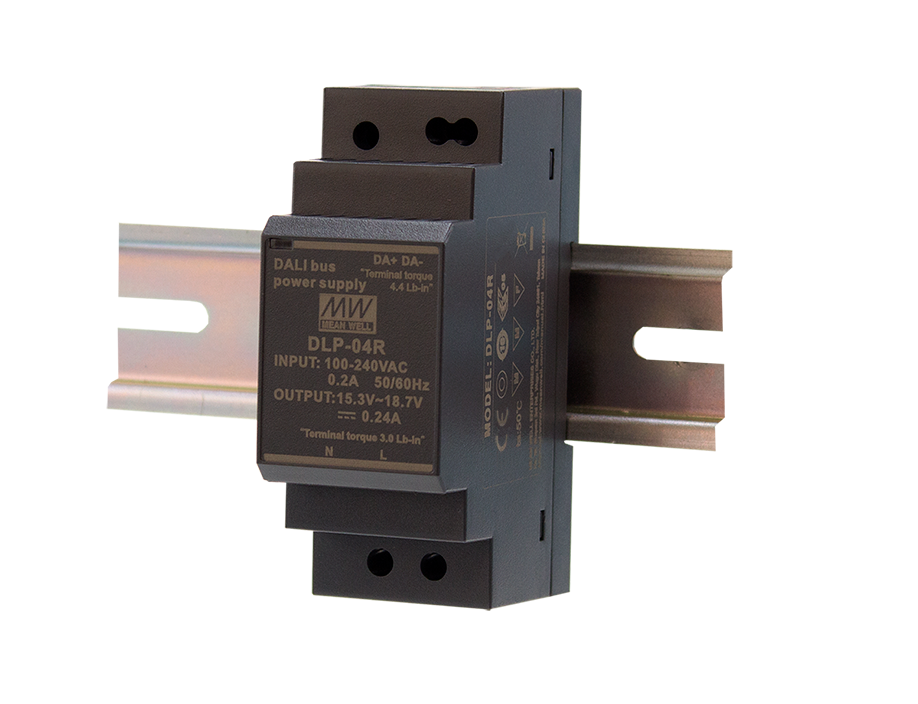 DLP-04R is a 3.84W 16V 240mA Din Rail Mount Dali Bus power supply with high efficiency and a small size, supplying 240mA for DALI control gears and DALI devices without power supply circuits.
